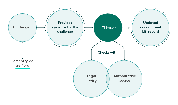 Jika kebenaran catatan data LEI dipertanyakan melalui fasilitas tantangan GLEIF, maka merupakan tanggung jawab organisasi penerbit LEI yang relevan untuk menyelesaikan masalah tersebut melalui dialog dengan Badan Hukum yang terkena dampak. Jika diperlukan, dan tunduk pada verifikasi lebih lanjut terhadap sumber yang otoritatif, penerbit LEI (Istilah yang biasanya dipakai dalam komunikasi eksternal) akan memperbarui informasi yang terkait dengan catatan LEI. Penerbit LEI (Istilah yang biasanya dipakai dalam komunikasi eksternal) bertujuan untuk menyelesaikan tantangan dalam waktu sepuluh hari kerja.
