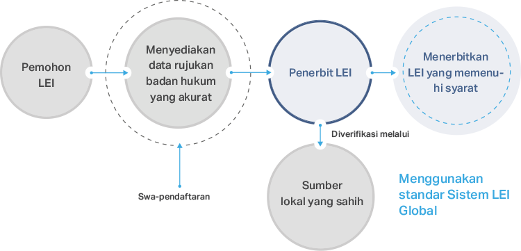 Rangkuman: Proses pemeliharaan kualitas data LEI dimulai dengan entitas pendaftar. Melalui pendaftaran mandiri, entitas pendaftar harus menyediakan data rujukan LEI yang akurat. Kemudian, organisasi penerbit LEI harus melakukan verifikasi data referensi LEI dengan sumber otoritas lokal – misalnya Daftar Perusahaan nasional – dan menerbitkan LEI sesuai dengan standar LEI. Setelah badan hukum mendapatkan LEI, Satuan Operator Lokal akan menerbitkan LEI tersebut bersama data rujukan badan hukum yang terkait. Setiap Satuan Operator Lokal menerbitkan file yang sudah diperbarui setiap hari termasuk semua LEI yang telah diterbitkan dan data rujukan yang terkait.