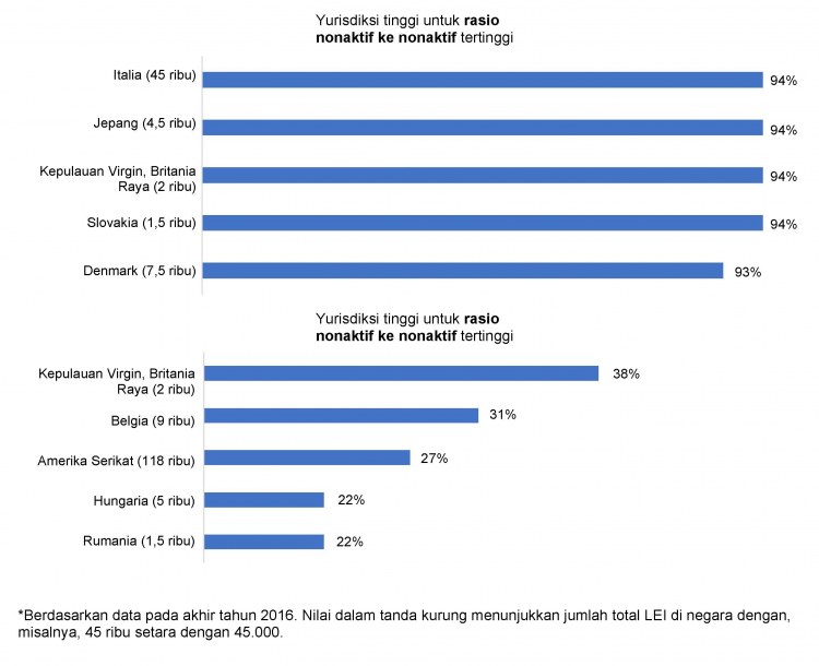 Analisis GLEIF terhadap populasi LEI nonaktif di seluruh wilayah hukum dengan lebih dari 1.000 LEI menunjukkan hasil sebagai berikut. Analisis ini didasarkan pada perbandingan tahun 2015 yang dibandingkan dengan data tahun 2016 untuk lima negara yang masing-masing menampilkan rasio tertinggi yang dijelaskan di atas: