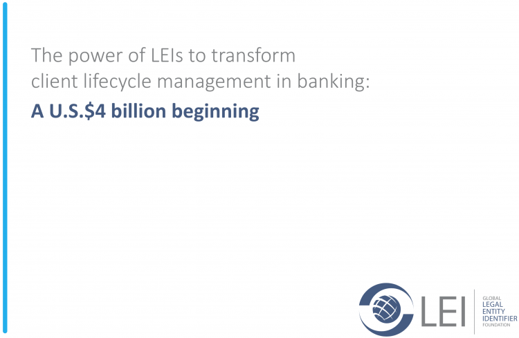 LEI telah digunakan untuk menyederhanakan proses kenali nasabah Anda (know-your-customer atau KYC) di pasar modal di seluruh dunia, sehingga ini merupakan tempat yang tepat untuk bank memulai integrasi LEI. Laporan terbaru yang dibuat bersama oleh GLEIF dan McKinsey mengungkapkan bahwa penggunaan LEI yang lebih luas di sektor perbankan global dapat menghemat pengeluaran industri sebesar US$2-4 miliar* setiap tahun hanya untuk biaya proses penerimaan nasabah. Dengan perkiraan total pengeluaran industri untuk bidang ini setara dengan US$40 miliar per tahun, peningkatan produktivitas yang diperoleh melalui penggunaan LEI dapat menghasilkan pengurangan biaya lintas sektor antara 5-10% per tahun.