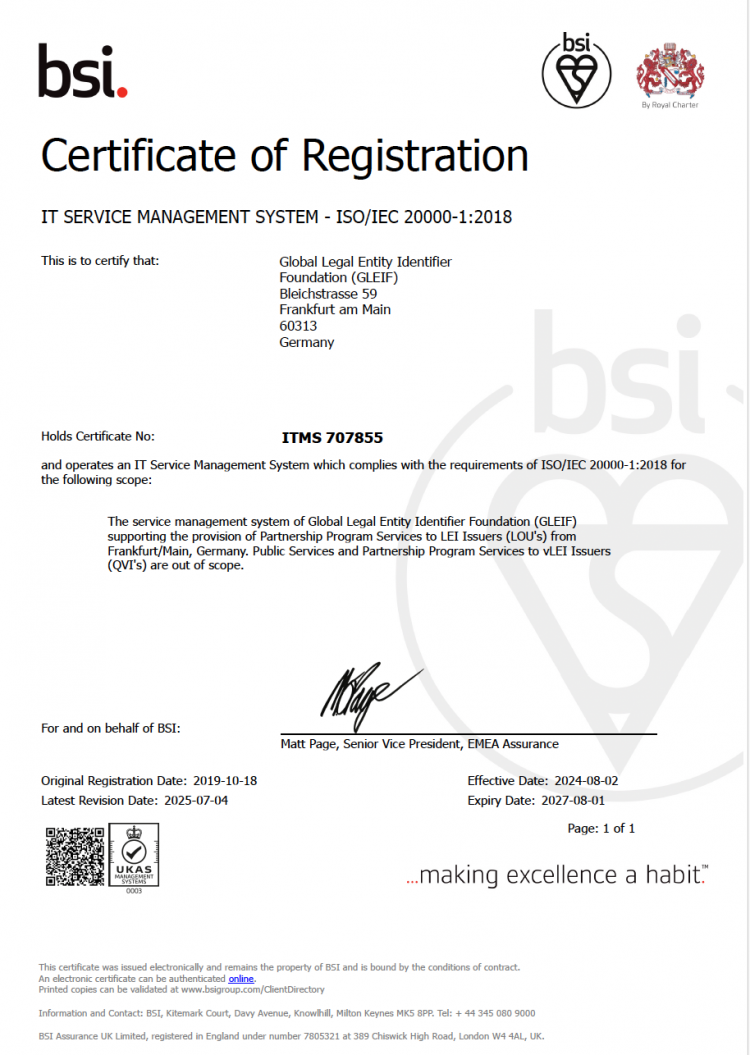 La GLEIF ha ottenuto la certificazione ISO/IEC 20000-1 nell'ottobre 2019. Una società di revisione esterna indipendente ha eseguito un esame rigoroso dei servizi del programma di partenariato offerto dalla GLEIF alle organizzazioni emittenti di codici LEI, note come Unità operative locali - Local Operating Units (LOU). La certificazione ISO 20000, tra gli altri vantaggi, dimostra come i valori della GLEIF siano perseguiti e raggiunti in termini di efficienza, eccellenza, flessibilità e affidabilità.