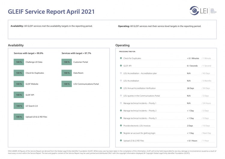 La Global Legal Entity Identifier Foundation (GLEIF) è impegnata ad assicurare trasparenza sulle sue prestazioni relativamente ai servizi offerti dalla GLEIF. Pertanto rendiamo disponibili per il download i rapporti mensili sui servizi che valutano le prestazioni complessive della GLEIF.