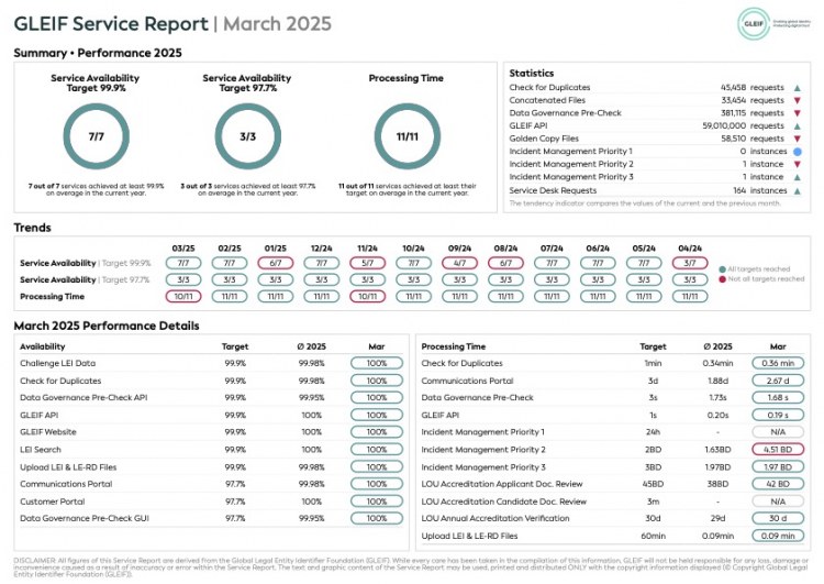 La Global Legal Entity Identifier Foundation (GLEIF) è impegnata ad assicurare trasparenza sulle sue prestazioni relativamente ai servizi offerti dalla GLEIF. Pertanto rendiamo disponibili per il download i rapporti mensili sui servizi che valutano le prestazioni complessive della GLEIF.