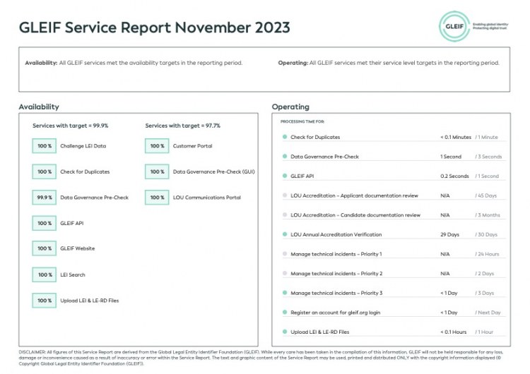 La Global Legal Entity Identifier Foundation (GLEIF) è impegnata ad assicurare trasparenza sulle sue prestazioni relativamente ai servizi offerti dalla GLEIF. Pertanto rendiamo disponibili per il download i rapporti mensili sui servizi che valutano le prestazioni complessive della GLEIF.