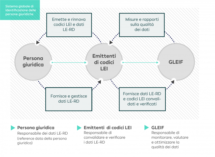 il processo per la gestione della qualità dei dati associati ai codici LEI inizia con l’entità registrante. Tramite un'auto-registrazione, tale entità deve fornire dati di riferimento della Persona giuridica esatti. È responsabilità dell'organizzazione che emette codici LEI verificare tali dati presso fonti ufficiali locali, ad esempio un registro nazionale delle imprese, ed emettere un codice LEI conforme allo standard in materia di codici LEI.