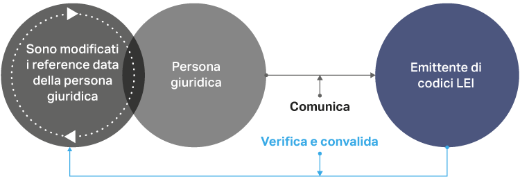 Secondo quanto stabilito dal LEI ROC, un’organizzazione che emette codici LEI è tenuta a riconvalidare, “regolarmente ed entro un anno dalla precedente verifica”, i reference data associati a un codice LEI emesso in passato sotto la sua amministrazione. In questa verifica finalizzata alla nuova convalida “è necessario controllare, insieme alla persona giuridica, che le informazioni pertinenti siano accurate”.