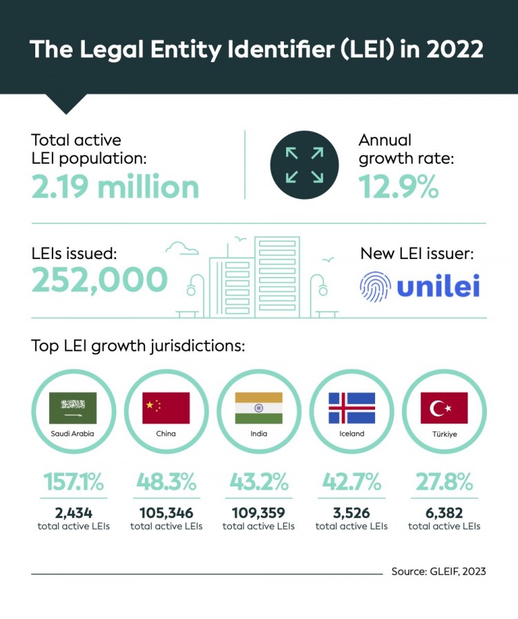 Il 2022 ha segnato un anno storico per la crescita dei codici LEI a livello mondiale. Nel primo trimestre si è registrato un picco di adozioni, raggiungendo un nuovo record di oltre due milioni di codici LEI, e l'anno si è concluso con una popolazione totale di codici LEI di 2,19 milioni e con l'emissione di più di 252.000 codici LEI. Ciò ha rappresentato una forte crescita annuale del 12,9%, riconfermando la crescente maturità del sistema globale LEI.