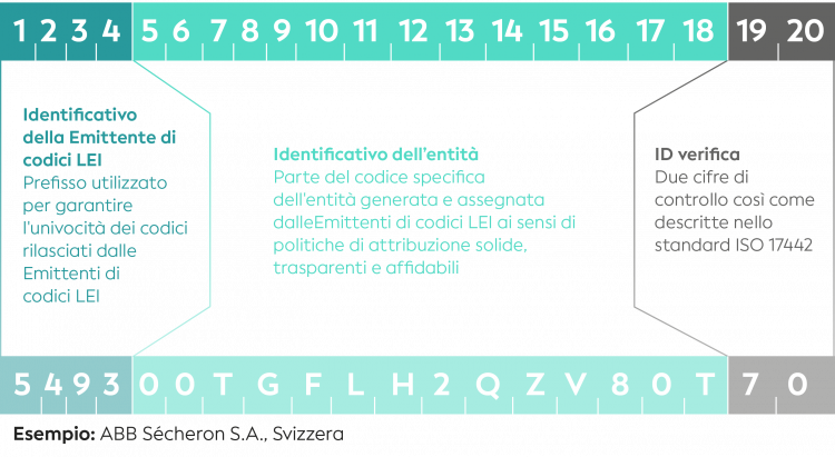 Per la gestione degli identificativi viene utilizzato un sistema di numerazione strutturato. Ai sensi di quanto previsto dallo standard ISO 17442, tale sistema è stato ulteriormente sviluppato dal Comitato di supervisione regolamentare (ROC), in base alle raccomandazioni del Consiglio per la stabilità finanziaria, come segue: