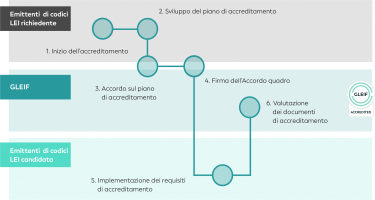 Il processo di accreditamento definito dalla Global Legal Entity Identifier Foundation (GLEIF), che deve essere completato dalle organizzazioni che intendono diventare emittenti di codici LEI, si articola in due fasi.