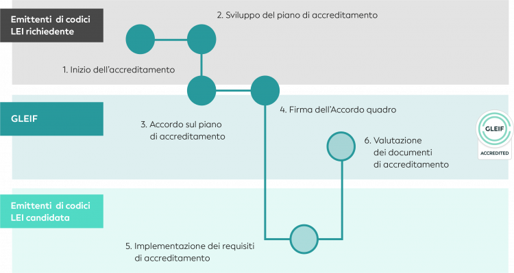 La prima fase del Processo di accreditamento prevede la creazione, da parte dell’organizzazione che intende diventare un emittente di Identificativi delle persone giuridiche (LEI), ossia l’Unità operativa locale (Local Operating Unit, LOU) richiedente, di un piano di accreditamento. Una volta che il piano riceve l’approvazione dalla GLEIF, viene sottoscritto l’ Accordo quadro. Lo stato della LOU richiedente diventa LOU candidata e inizia la seconda fase del processo di accreditamento.