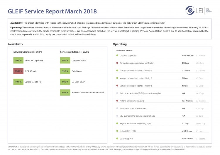 Global Legal Entity Identifier Foundation (GLEIF)は、GLEIFが提供するサービスに関する履行状況の透明性確保に取り組んでいます。そのために、GLEIFの作業全体を評価した月次サービスレポートをダウンロードできるようにしています。