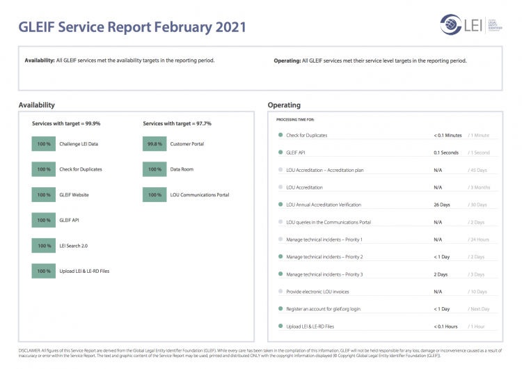 Global Legal Entity Identifier Foundation (GLEIF)は、GLEIFが提供するサービスに関する履行状況の透明性確保に取り組んでいます。そのために、GLEIFの作業全体を評価した月次サービスレポートをダウンロードできるようにしています。