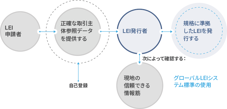 概要: LEIデータの品質維持プロセスは、まず取引主体の登録から始まります。取引主体は自己登録を行い、正確なLEI参照データを提供する必要があります。次に、LEI発行組織は、現地当局(国の商業登記所など)によるLEIデータの確認を経て、LEI基準に準拠するLEIを発行する必要があります。取引主体がLEIを取得すると、発行元の付番機関が、関連する取引主体参照データとともにそれを公開します。各付番機関は、発行したLEIや関連する参照データを含む更新済みファイルを毎日公開します。