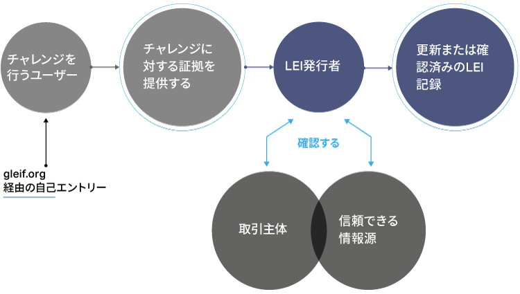 GLEIFのウェブサイトを通じてオンラインでチャレンジが記録されると、それに対応するため、GLEIFはただちにその情報を関連するLEI発行組織に送信します。LEI発行組織は、影響を受けた取引主体と協力し、責任を持ってこれを解決する必要があります。必要に応じて、LEI発行者は信頼できる情報源と照らし合わせ、LEI記録の関連情報を更新し、 チャレンジ事項を10営業日以内に解決することを目指します。