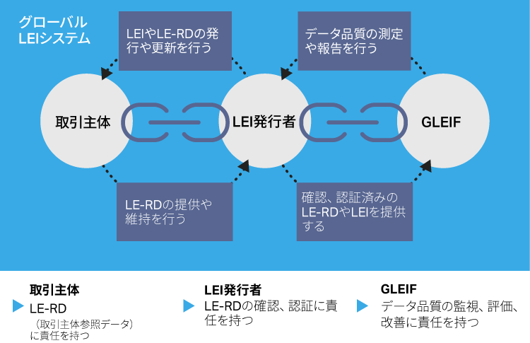 LEIデータの品質維持プロセスは、まず取引主体の登録から始まります。取引主体は自己登録を行い、正確なLEI参照データを提供する必要があります。次に、LEI発行組織(または「付番機関」)は、現地当局(国の商業登記所など)によるLEIデータの確認を経て、LEI基準に適合するLEIを発行する必要があります。LEI発行組織は、登録済みの取引主体や、LEIの取得を希望する取引主体の主な窓口となります。