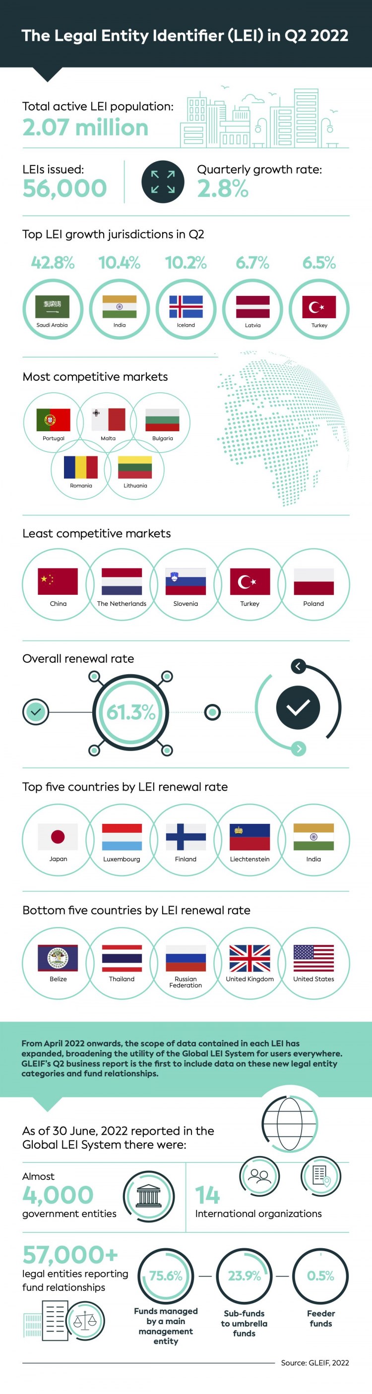2022年第2四半期を対象とする最新のレポートでは、同四半期に世界で発行されたLEIは5万6,000件を超えたことが明らかになり、四半期の伸び率は2.8% となりました。その結果、有効なLEIの全体数は207万件に達しています。