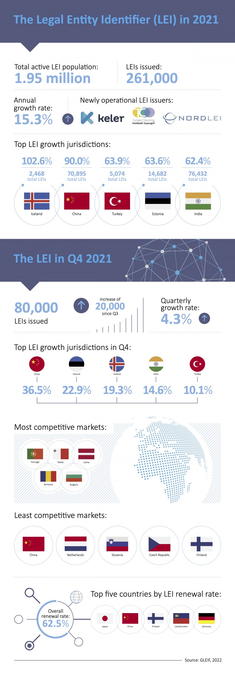 第4四半期について、中国はアイスランドを追い抜いて最も高いLEIの成長率を示し、36.5%と大幅に増えて、今年最大の伸びを示しました。その後にエストニア(22.9%)、アイスランド(19.3%)、インド(14.6%)、トルコ(10.1%)が続きました。中国とインドでLEIが増えたのは、規制要件の拡大に直接関係している可能性があり、エストニアとアイスランドでみられた伸びは、LEI発行者間の競争の激化が要因にあります。