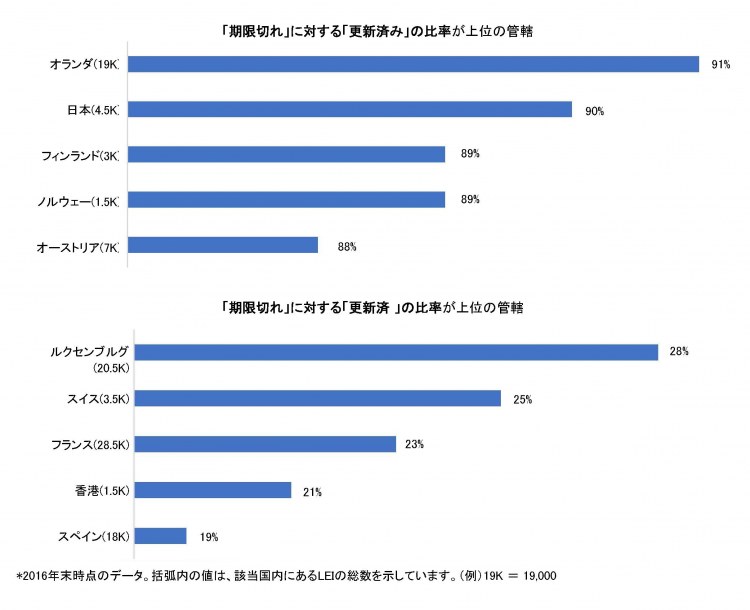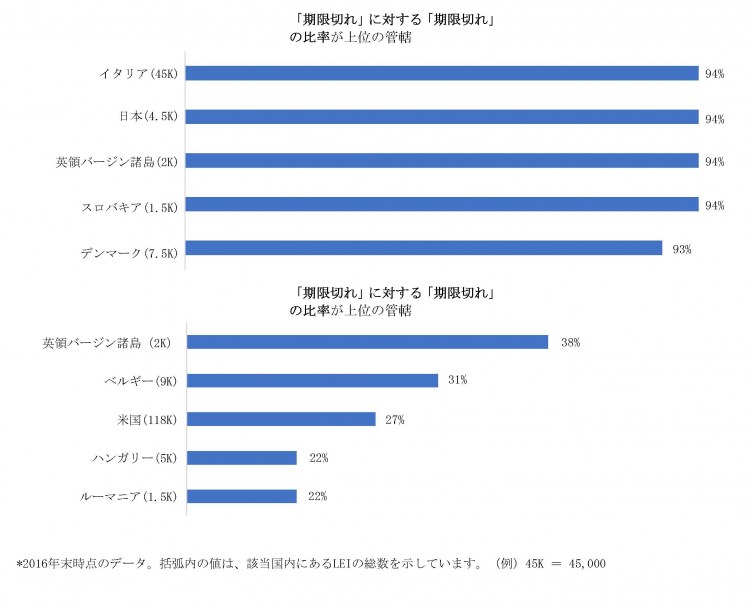 「期限切れ」に対する「更新済み」の比率: これは、2015年末の時点ですでに期限切れになったものの2016年に更新されたLEIの比率です。このケースでは、取引主体は、前回コミットされた更新日の後にLEIを更新しています。