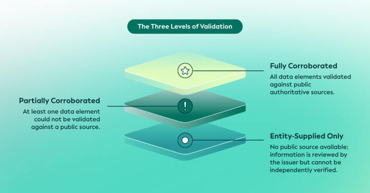 グローバルLEIシステムでは、データの補強程度を示すために3段階のレベルを使用しています: