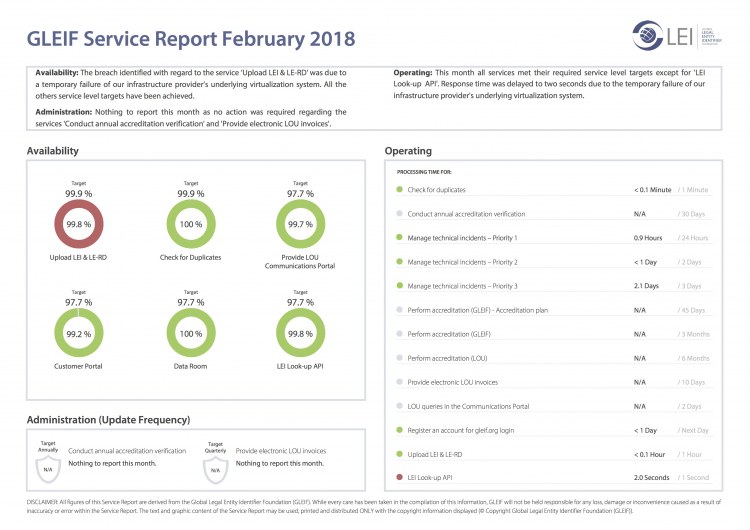 Global Legal Entity Identifier Foundation (GLEIF)GLEIF에서 제공하는 서비스와 관련한 성과를 투명하게 알리고자 최선을 다합니다. 따라서, 저희는 전체적인 GLEIF 성과를 평가하는 월간 서비스 보고서를 다운로드 파일로 제공해드립니다.