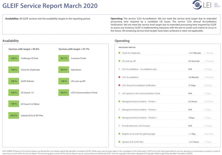Global Legal Entity Identifier Foundation (GLEIF)GLEIF에서 제공하는 서비스와 관련한 성과를 투명하게 알리고자 최선을 다합니다. 따라서, 저희는 전체적인 GLEIF 성과를 평가하는 월간 서비스 보고서를 다운로드 파일로 제공해드립니다.