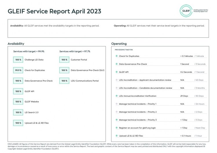 Global Legal Entity Identifier Foundation (GLEIF)GLEIF에서 제공하는 서비스와 관련한 성과를 투명하게 알리고자 최선을 다합니다. 따라서, 저희는 전체적인 GLEIF 성과를 평가하는 월간 서비스 보고서를 다운로드 파일로 제공해드립니다.