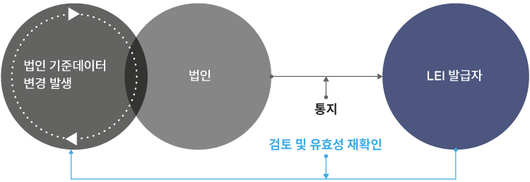 LEI가 다른 식별 기호와 다른 주요 사항으로는, 법인이 획득한 LEI를 정기적으로 갱신해야 한다는 점입니다. 갱신을 통해 등록 법인과 관련된 LEI 기준 데이터는 제3자 자료와 대조하여 다시 유효성을 검사하게 됩니다. 그러므로 갱신은 전체 LEI 모집단에 대한 뛰어난 데이터 품질을 보장하는 데 있어서 필수적이고, 이를 통해 글로벌 LEI 시스템에 대한 신뢰성도 보장하게 됩니다.