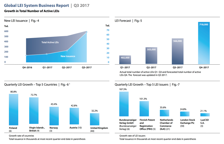 2017년 11월에 Global Legal Entity Identifier Foundation(GLEIF)은 법인식별기호(LEI) 도입과 관련된 주요 진전 사항을 다룬 세 번째 분기별 보고서를 발행했습니다. 특히 이 보고서에서는 연간 성장 및 갱신 예상치에 대해 평가하고, 글로벌 LEI 시스템 내 운영 중인 LEI 발급 기관 간의 경쟁 수준을 평가하며, LEI 갱신 비율 및 기준데이터 확증을 분석합니다. 2017년 7월부터 GLEIF는 법인이 제공한 직접 및 최종 모기업의 정보에 대한 통계자료도 제공합니다.