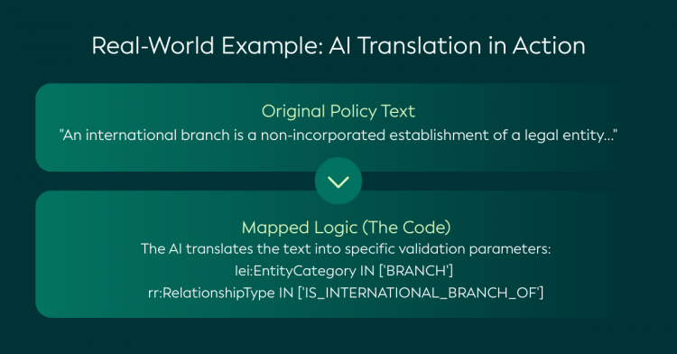 GLEIF는 LLM을 사용하여 새로운 규칙의 식별을 지원하고 기존 데이터 품질 점검의 잠재적 모순을 감지하여 규정 및 정책 문서에서 실행에 이르는 엔드투엔드 검토 프로세스를 가능하게 합니다.