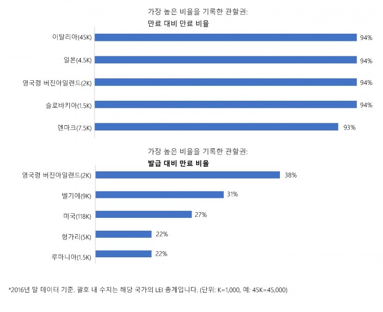 또한, 이를 통해 볼 수 있듯이 GLEIF가 해당 기관의 만료 LEI 비율을 기반으로 LEI 발급 기관을 제재할 위치가 아니라는 것도 강조되어야 합니다. GLEIF는 각 LEI 발급자가 GLEIF와 LEI 발급 기관 간의 관계를 규정하는 계약 체계인 기본 합의서에 명시된 서비스를 수행하도록 할 책임이 있습니다. 현재까지 LEI 발급자가 갱신 서비스를 부적절하게 수행하여 LEI 만료가 초래되었다는 징후는 전혀 없습니다. 이에 반하여, LEI가 1,000개 이상인 관할권에서 만료된 LEI에 대해 2015년 대비 2016년 데이터를 비교한 GLEIF의 분석에서 나타났듯이 LEI 발급 기관들은 모든 등록 법인에 대한 개별 실사를 시행합니다. 그럼에도 불구하고 등록 법인의 약 30퍼센트가 LEI를 제때 갱신하지 않기로 한 것은 개별 LEI 발급자의 통제 범위를 벗어난 것입니다.
