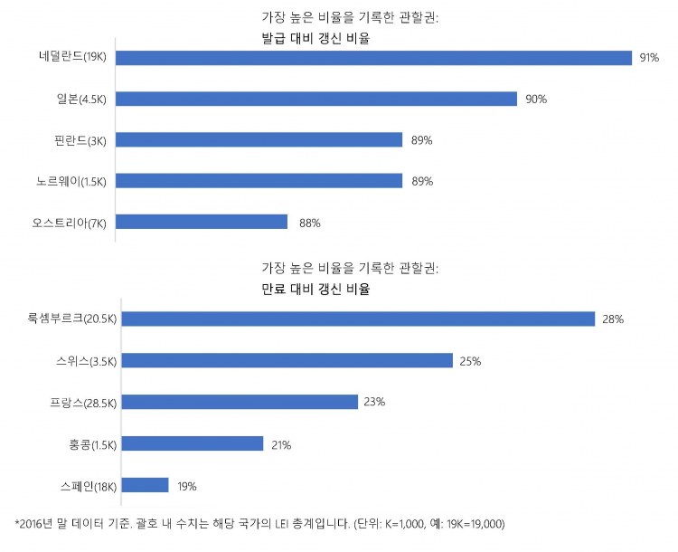 이 스냅샷은 LEI를 관리하는 LEI 발급자에 상관없이 전체 LEI 분야는 물론 한 국가 내에서 LEI를 보유한 개별 법인의 행동을 특성화하는 여러 역학 관계를 보여줍니다. 이는 또한 한 국가에서 상반된 추세가 관찰될 수 있다는 것도 보여줍니다. 예를 들어, 일본의 경우 2015년에 발급된 LEI 중 2016년에 적절하게 갱신된 LEI 비율이 두 번째로 높았으며, 2015년에 만료된 LEI 중 2016년에도 계속 만료된 상태로 남아있는 LEI 비율도 두 번째로 높았습니다.