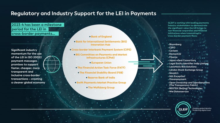 Lata 2023-24 to przełomowy okres dla systemu LEI w płatnościach transgranicznych, ponieważ apele o włączenie kodów LEI do komunikatów płatniczych standardu ISO 20022 zaczęły napływać od najważniejszych uczestników rynku finansowego, w tym instytucji takich jak Rada Stabilności Finansowej, Grupa Specjalna ds. Przeciwdziałania Praniu Pieniędzy, BIS-CPMI, Bank Anglii, grupa robocza Payments Market Practice Group (PMPG) działająca przy organizacji Swift, Grupa Wolfsberg i Londyńska Giełda Papierów Wartościowych (LSE).