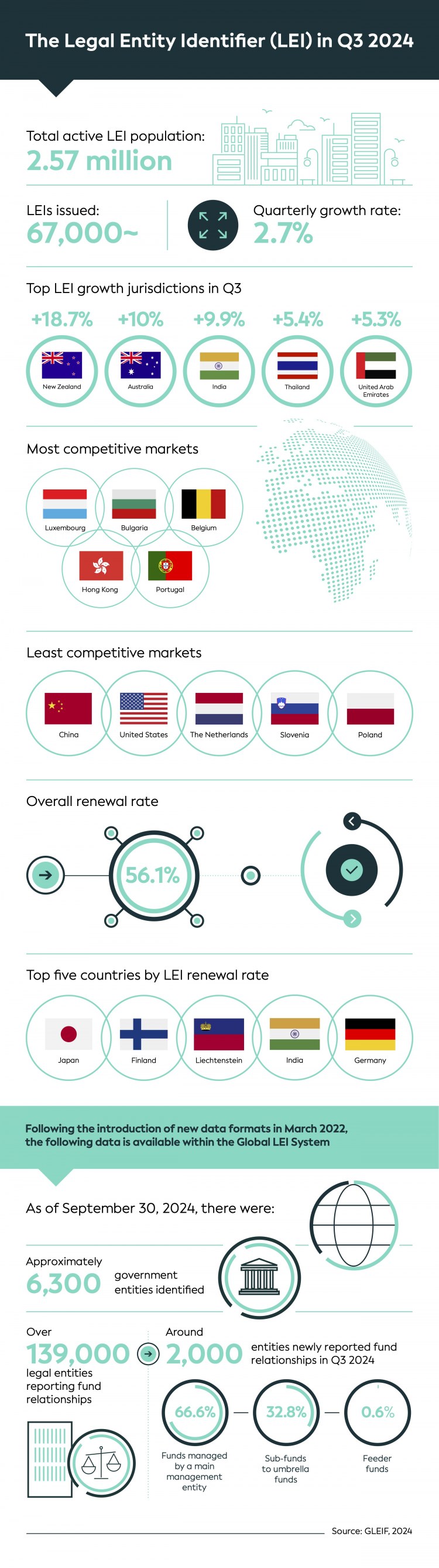 Z najnowszego raportu za III kwartał 2024 r. wynika, że na całym świecie wydano w tym okresie około 67 000 kodów LEI. Łączna liczba aktywnych kodów LEI przekroczyła zatem 2,57 miliona. Kwartalny wskaźnik wzrostu wynosi zatem 2,7%, co jest szczególnie dobrym wynikiem zwłaszcza w okresie urlopowym w wielu jurysdykcjach.