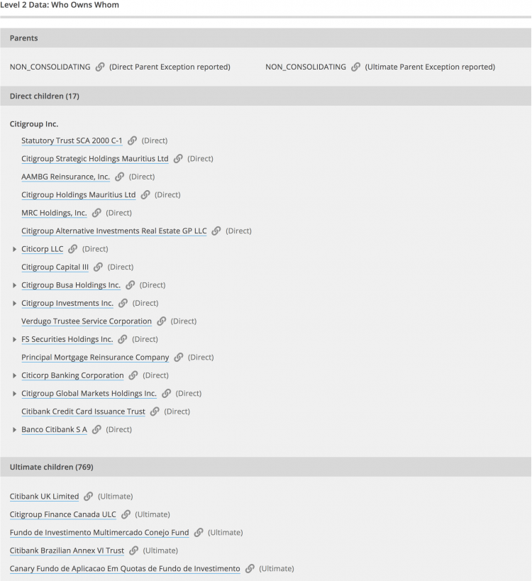 A imagem mostra um trecho do Registro de LEI do Citigroup Inc. em 11 de dezembro de 2018. Observação: As informações incluídas em um registro LEI são atualizadas regularmente. Assim, as informações exibidas com o registro de LEI do Citigroup Inc. podem ser diferentes das apresentadas na imagem acima.