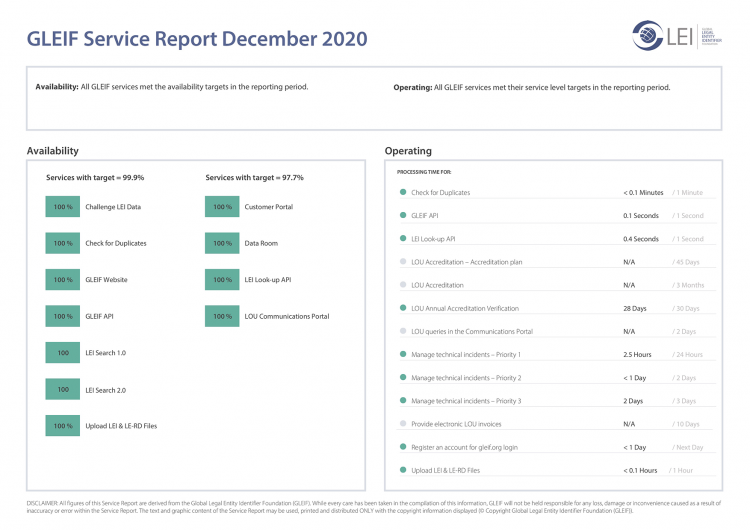 Фонд Global Legal Entity Identifier Foundation (GLEIF) делает все возможное для обеспечения прозрачности услуг, предоставляемых GLEIF. С этой целью он публикует доступные для загрузки ежемесячные отчеты об услугах, в которых оценивается общая эффективность работы GLEIF.