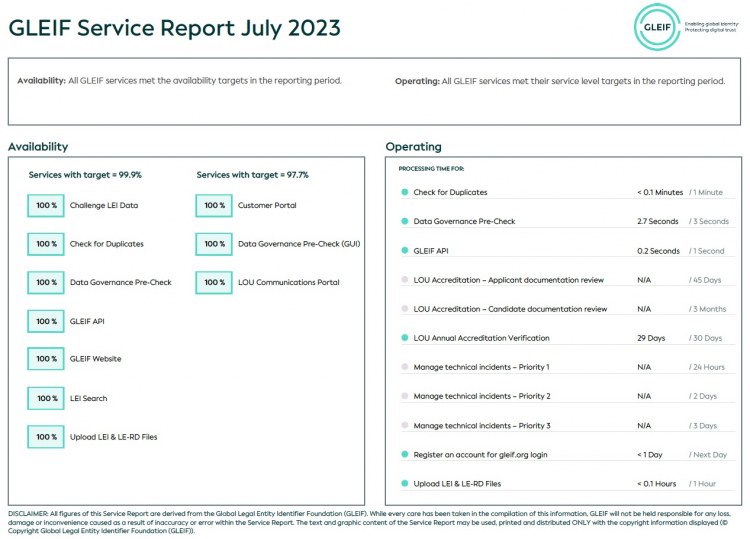 Фонд Global Legal Entity Identifier Foundation (GLEIF) делает все возможное для обеспечения прозрачности услуг, предоставляемых GLEIF. С этой целью он публикует доступные для загрузки ежемесячные отчеты об услугах, в которых оценивается общая эффективность работы GLEIF.