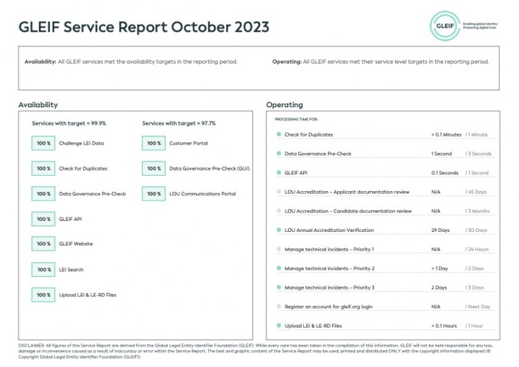 Фонд Global Legal Entity Identifier Foundation (GLEIF) делает все возможное для обеспечения прозрачности услуг, предоставляемых GLEIF. С этой целью он публикует доступные для загрузки ежемесячные отчеты об услугах, в которых оценивается общая эффективность работы GLEIF.