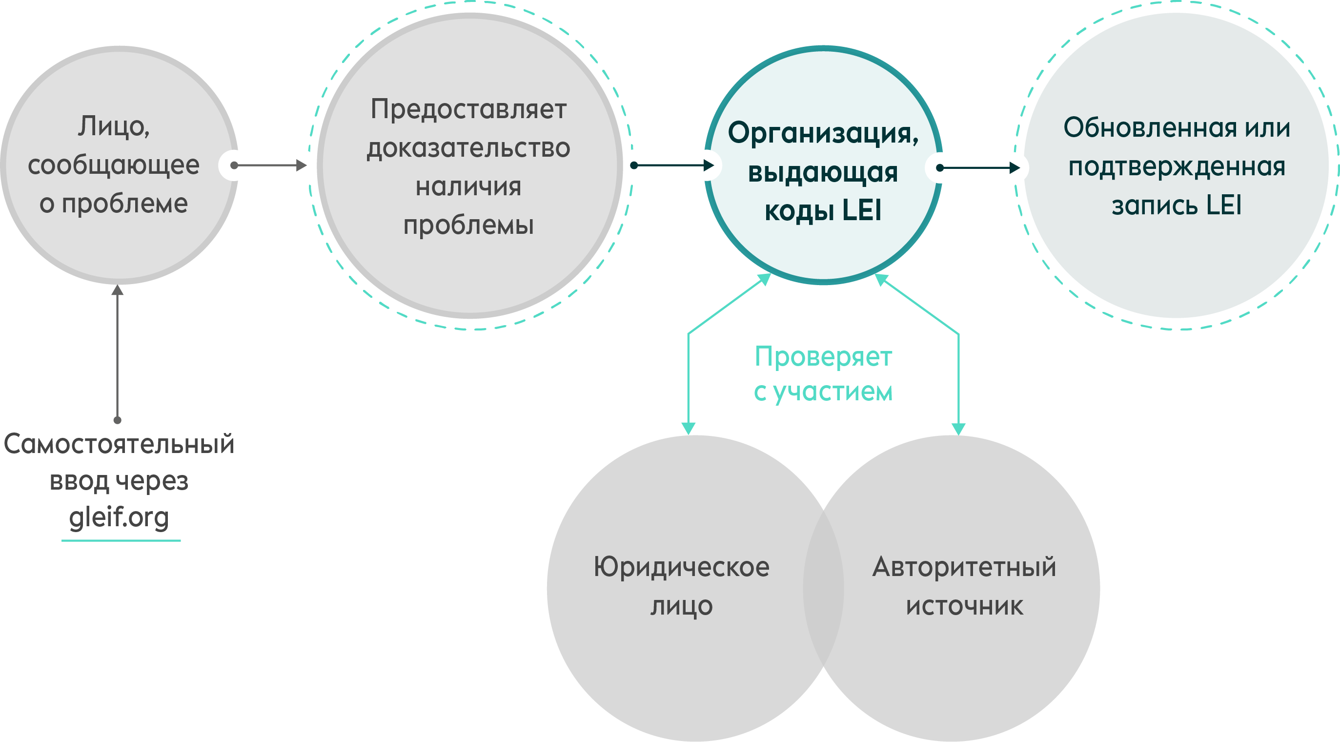 Любая заинтересованная сторона может заявить о проблемах в записи данных для любого кода LEI. Могут быть предложены новые данные, которые считаются более точными, или (например, если правильные данные неизвестны) могут быть представлены комментарии с указанием причины для обновления поля с данными.