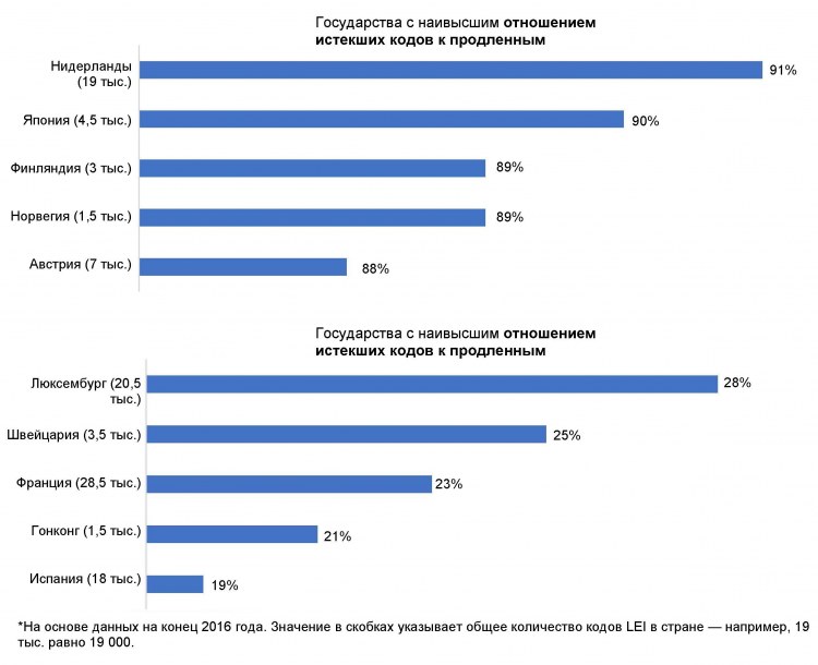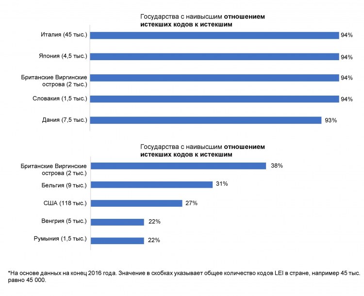 Анализ фонда GLEIF истекших кодов LEI по странам, в которых выдано более 1000 кодов LEI, демонстрирует следующие результаты. В основе анализа лежит сравнение данных 2015 и 2016 годов для пяти стран, соответственно, в которых зафиксированы самые высокие отношения кодов, описанные выше: