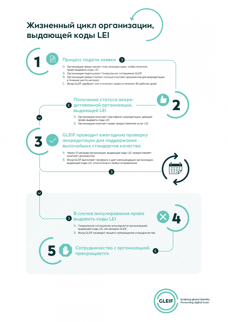 Более подробную информацию об аккредитации фондом GLEIF организаций, выдающих коды LEI (включая описание различных этапов их жизненного цикла), можно получить по следующей ссылке: