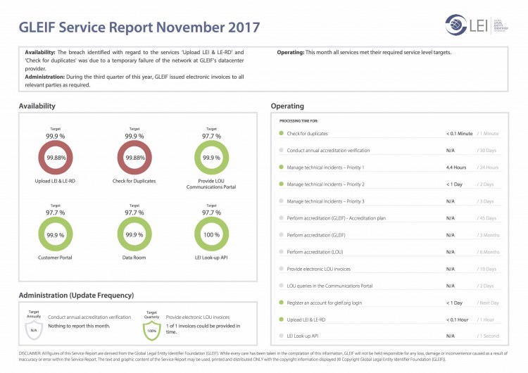 Global Legal Entity Identifier Foundation (GLEIF), GLEIF tarafından sunulan hizmetler konusunda performansında şeffaflığı güvence altına almaya kendini adamıştır. Bu nedenle, GLEIF performansının genel olarak değerlendirildiği aylık servis raporlarını indirilmek üzere kullanıma sunuyoruz.