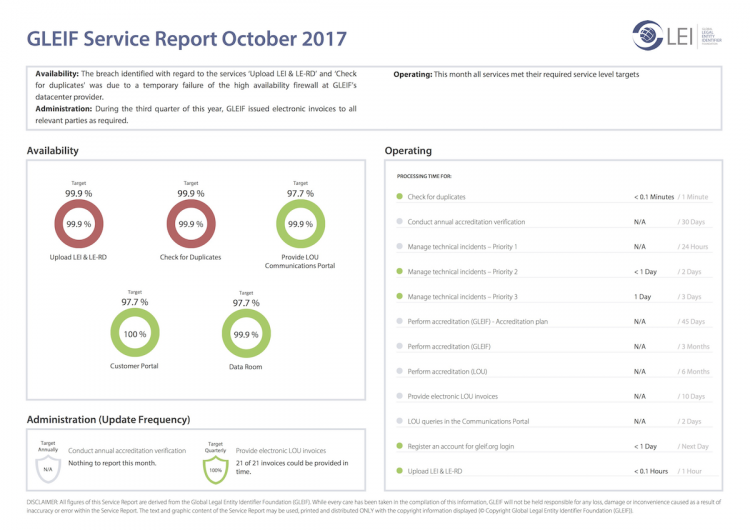 Global Legal Entity Identifier Foundation (GLEIF), GLEIF tarafından sunulan hizmetler konusunda performansında şeffaflığı güvence altına almaya kendini adamıştır. Bu nedenle, GLEIF performansının genel olarak değerlendirildiği aylık servis raporlarını indirilmek üzere kullanıma sunuyoruz.