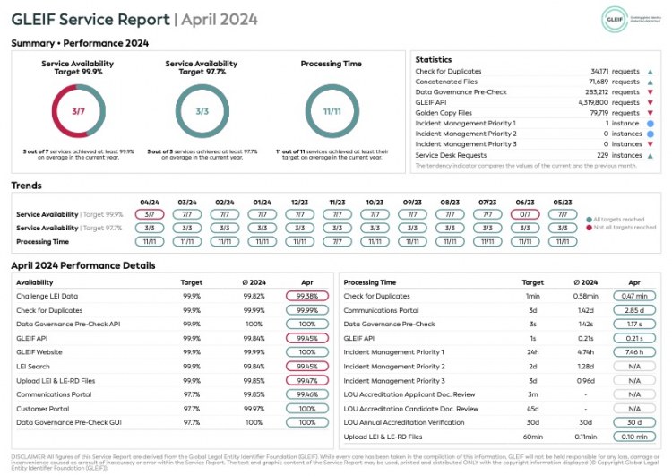 Global Legal Entity Identifier Foundation (GLEIF), GLEIF tarafından sunulan hizmetler konusunda performansında şeffaflığı güvence altına almaya kendini adamıştır. Bu nedenle, GLEIF performansının genel olarak değerlendirildiği aylık servis raporlarını indirilmek üzere kullanıma sunuyoruz.