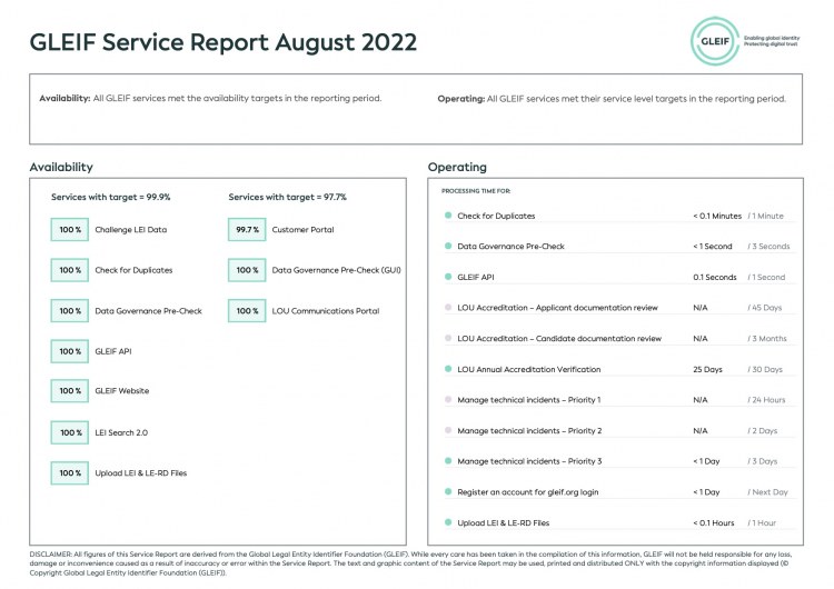 Global Legal Entity Identifier Foundation (GLEIF), GLEIF tarafından sunulan hizmetler konusunda performansında şeffaflığı güvence altına almaya kendini adamıştır. Bu nedenle, GLEIF performansının genel olarak değerlendirildiği aylık servis raporlarını indirilmek üzere kullanıma sunuyoruz.