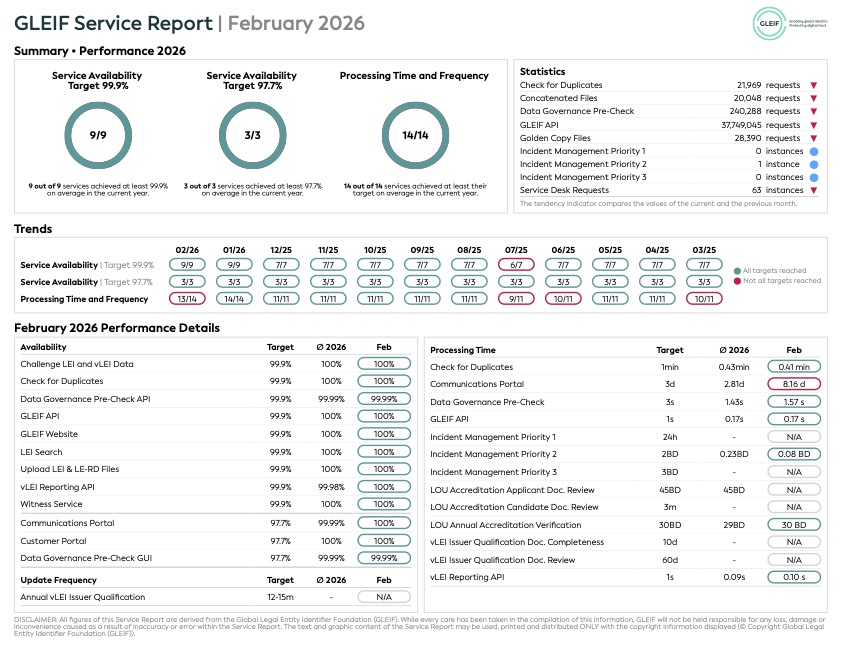Global Legal Entity Identifier Foundation (GLEIF), GLEIF tarafından sunulan hizmetler konusunda performansında şeffaflığı güvence altına almaya kendini adamıştır. Bu nedenle, GLEIF performansının genel olarak değerlendirildiği aylık servis raporlarını indirilmek üzere kullanıma sunuyoruz.