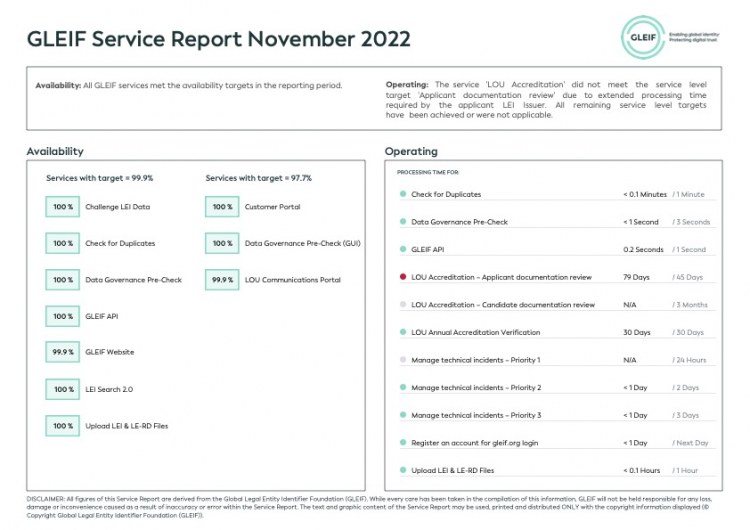 Global Legal Entity Identifier Foundation (GLEIF), GLEIF tarafından sunulan hizmetler konusunda performansında şeffaflığı güvence altına almaya kendini adamıştır. Bu nedenle, GLEIF performansının genel olarak değerlendirildiği aylık servis raporlarını indirilmek üzere kullanıma sunuyoruz.