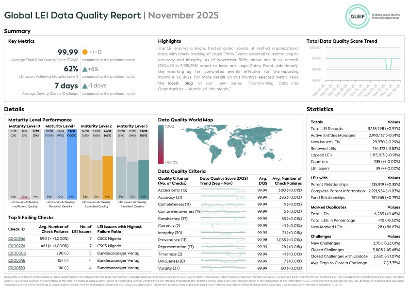 Global Legal Entity Identifier Foundation (GLEIF) aşağıdaki veri kalitesi raporlarını aylık olarak yayınlar: