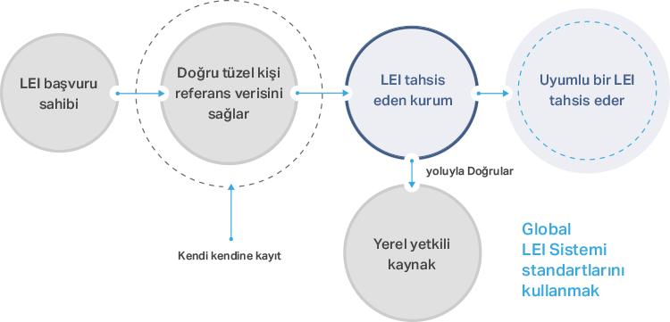 Özetlenirse: LEI veri kalitesini sürdürme süreci, tüzel kişinin kaydedilmesi ile başlar. Kendi kendine kayıt yoluyla, kayıt yapan tüzel kişi doğru LEI referans verilerini sağlamalıdır. Ardından LEI tahsis eden kurum, LEI referans verilerini yerel yetkili kaynakla birlikte (örneğin, ulusal Ticaret Sicili) doğrulamalı ve LEI standardına uygun bir LEI tahsis etmelidir. Tüzel kişiye ait LEI tahsis edildiğinde, bu kod LEI'yi tahsis eden Yerel İşletim Birimi tarafından ilgili tüzel kişi referans verisiyle birlikte yayınlanacaktır. Her bir Yerel İşletim Birimi, tahsis ettiği LEI'ler ve ilgili referans verisini içeren günlük güncellenmiş dosyalar yayımlar.