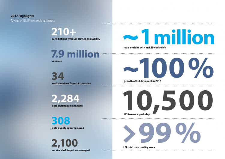 Nisan 2018'de Global Legal Entity Identifier Foundation (GLEIF), 1 Ocak ile 31 Aralık 2017 arasındaki dönem için GLEIF operasyonlarının durumunu, finansal durum açıklamalarını ve bağımsız denetçinin raporunu vurgulayan en son yıllık raporunu yayımlamıştır (aşağıdaki ‘ilgili bağlantılar’ bölümüne bakınız).