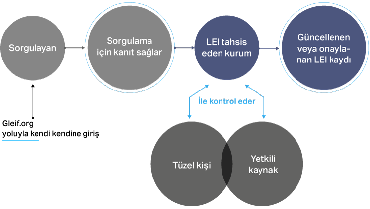 GLEIF Web sitesinde mevcut çevrimiçi form kullanılarak bir sorgulama kaydedildiğinde, GLEIF bilgiyi ilgili LEI tahsis eden kuruluşa takip için derhal gönderir. Etkilenen tüzel kişi ile diyalog halinde konunun çözüme kavuşturulması ilgili LEI tahsis eden kuruluşun sorumluluğudur. Gerekirse ve yetkili bir kaynağa karşı ilave doğrulamaya tâbi olarak, LEI tahsis eden kurum bir LEI kaydıyla ilgili bilgiyi güncelleyecektir. Hedef, sorgunun on iş günü içinde çözümlenmesidir.